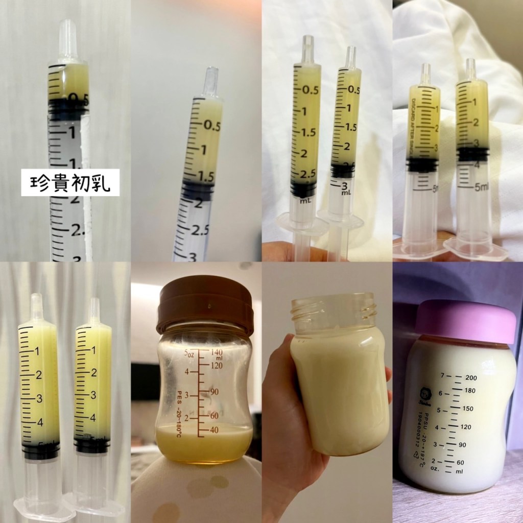 我獲得一把3ml的空針筒用來搜集母乳,當天非常賣力的手擠半小時才有一眯眯的0.5ml,用「珍貴」這兩個字來形容再貼切不過,奇妙的是,第一次是讓潔瓜練習右邊乳房,所以左邊怎麼擠都沒有半滴,隔天把她抓來吸左邊後,從此開關就被打開,也開啟了3-4小時鬧鐘響就準備擠奶的黑眼圈日常。