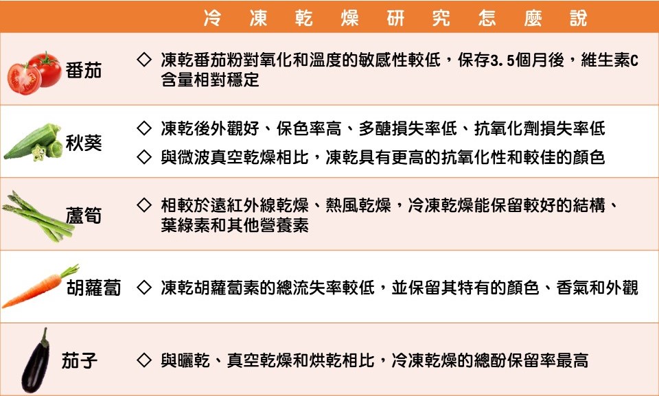 食物冷凍乾燥的過程也受到多種因素的影響,包括不同的前處理、加熱溫度、冷凍溫度和速率、真空…等,不同的操作條件影響食物的外觀、含水量、復水性和總酚含量,簡單來說就是每一家的技術略有不同,食物成品的營養價值、色香味也就會不太一樣囉! 那到底冷凍乾燥技術是否能保留食物當中較完整的營養素呢?我們直接來看看研究怎麼說吧: