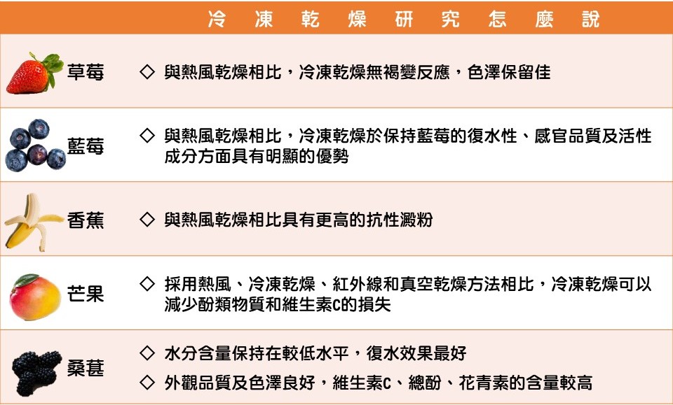 但不表示所有食物都適合用快速油炒的方式,水果類因為富含維生素C、多酚化合物,經過熱處理會造成營養素的流失,所以食品業者利用冷凍乾燥的技術,用在這類食物上,較能保存食物原有的色、香、味以及營養價值,且也利於保存及攜帶,因為爸爸媽媽一定不會希望出門遊玩,為了準備新鮮的香蕉、蘋果、橘子等水果,在路途中還要擔心水果會不會被壓傷、被悶壞、還要削皮清洗甚至怕寶寶吃的黏踢踢等的這些麻煩事。